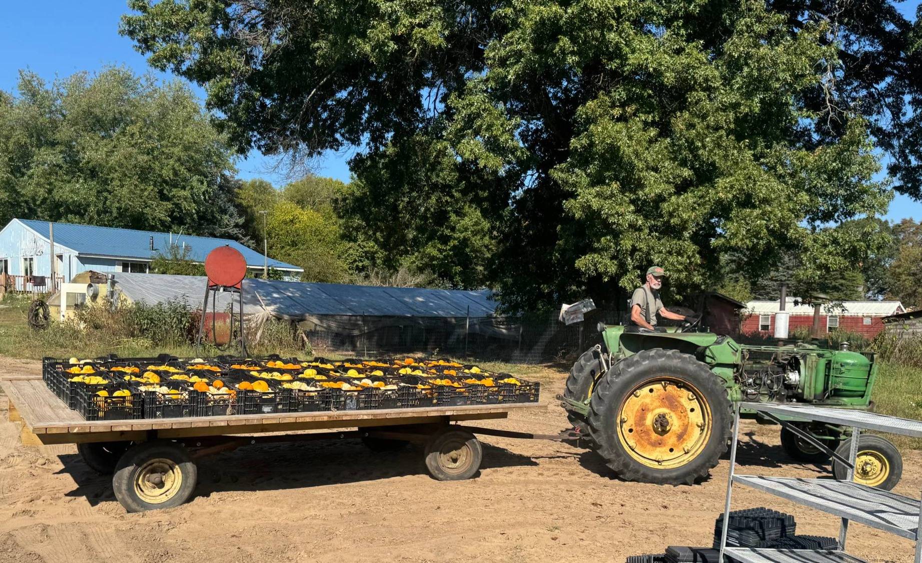 Papa Paul is driving the harvest out of the field. Each one of the black containers on the wagon holds a bounty of squash, gourds, or pumpkins! Photo credit: Cari B.