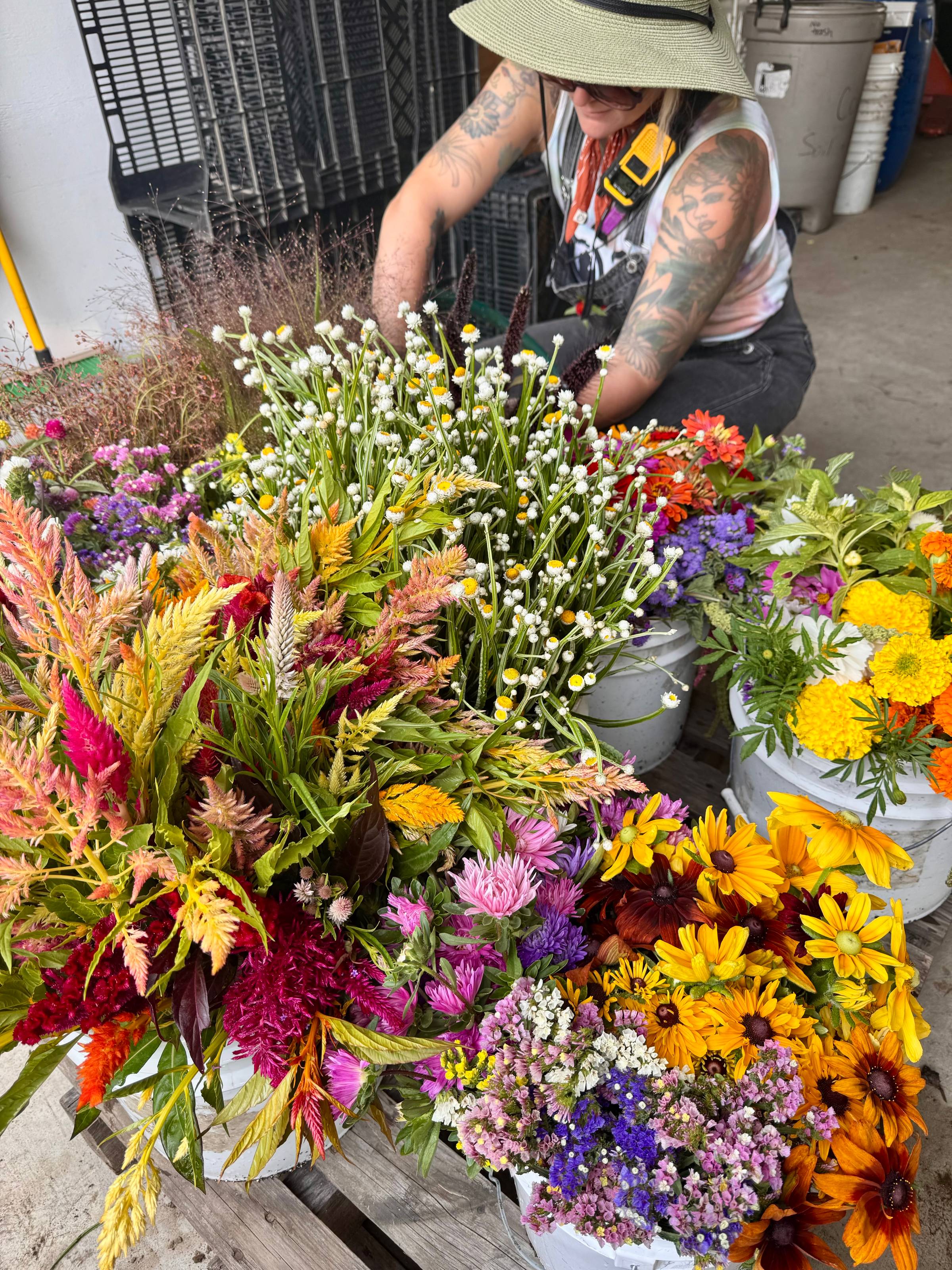 Farmer Bee 🐝 looking over the bounty of Monday's harvest for CSA Flower shares. It's always such a mix of colors and textures that belongs in a painting! Photo credit, Cari B.
