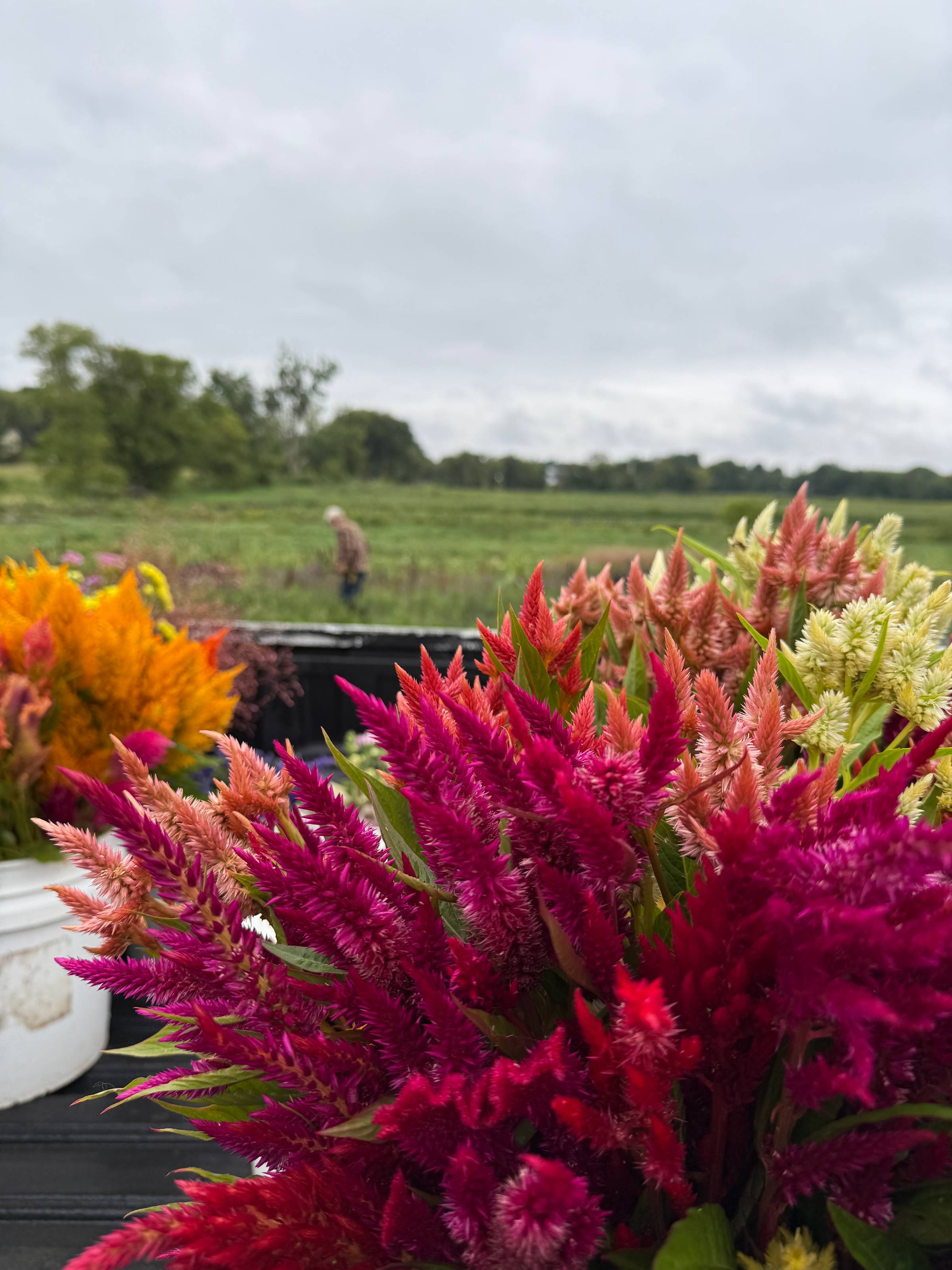 Harvesting flowers on a dreary Thursday, with Wheat Celosia in the foreground and Paul in the background. The cooler weather is great for us and the flowers! (Also, what is it about overcast days that makes the colors "pop"?)
