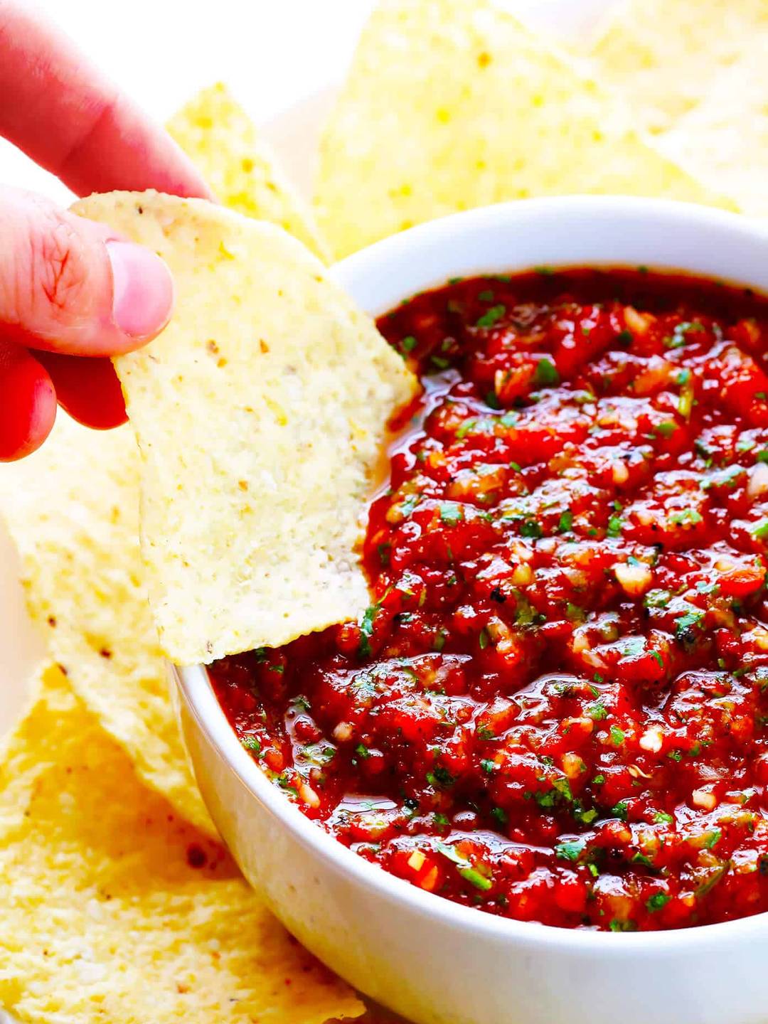 🌶️ Restaurant-Style Salsa- A classic, blender-friendly salsa that uses fresh jalapeños for just the right amount of kick. Perfect with chips or tacos. From Gimme Some Oven